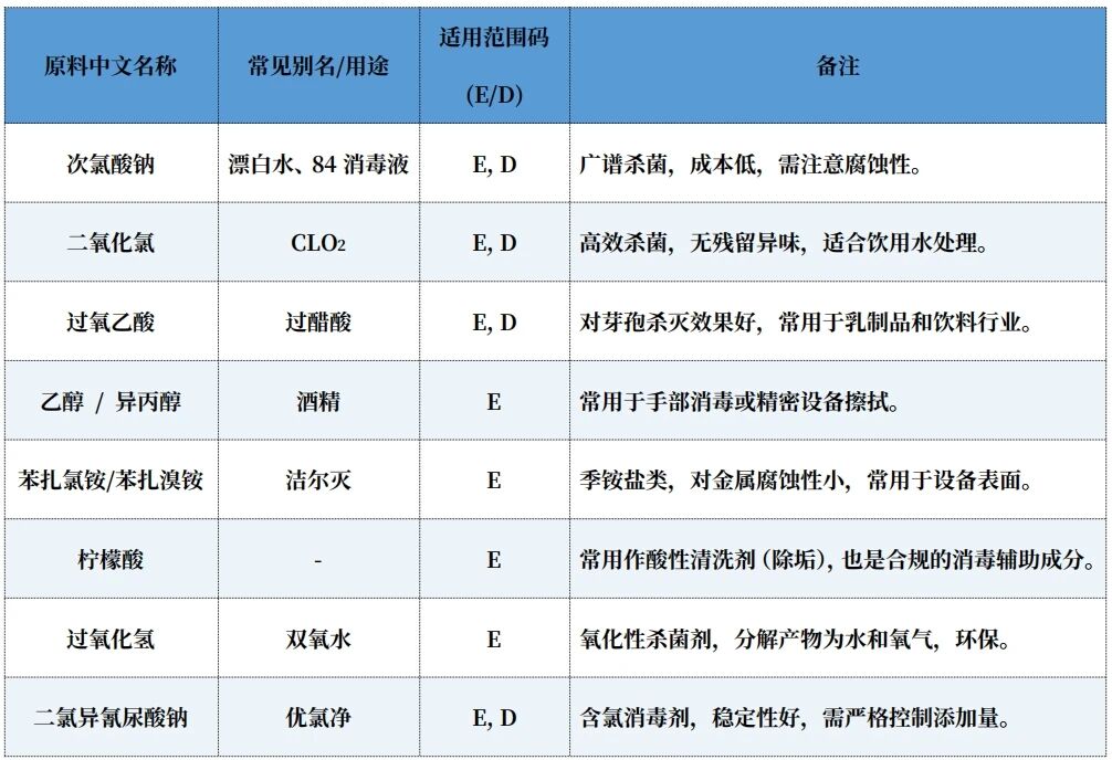 糾正: 標(biāo)準(zhǔn)中列出了明確的清單(表1),例如,甲醛(Formaldehyde)、戊二醛(Glutaraldehyde)雖然在醫(yī)療領(lǐng)域常用,但在標(biāo)準(zhǔn)表1中其使用范圍主要限于醫(yī)療器械(M)或特定環(huán)境,且標(biāo)注了毒性。在食品工業(yè)中,必須嚴(yán)格篩選對(duì)食品無(wú)污染、無(wú)毒性的成分(如過(guò)氧乙酸、二氧化氯)。